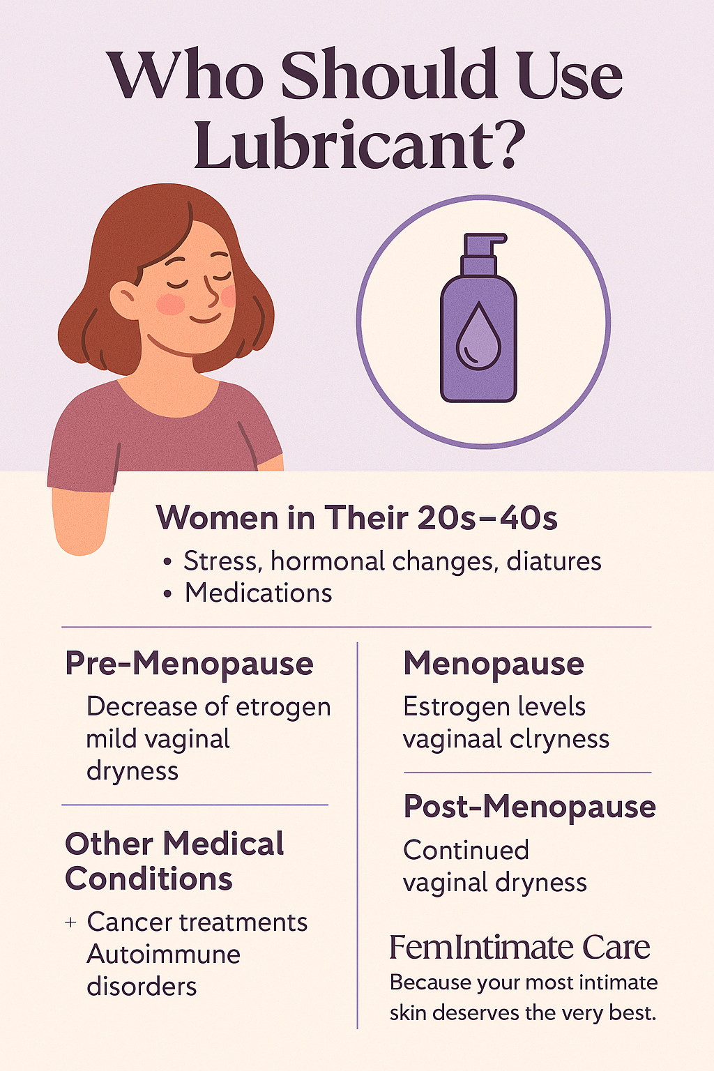 At FemIntimate Care, our doctor-approved, pH-balanced lubricants are designed for women at every stage of life. Whether you’re in your 20s, approaching menopause, or post-menopausal, there are times when your body may benefit from extra support.